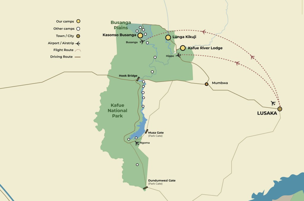 We should aim to be through customs and immigration in time to catch a charter flight at about 3:00 PM to fly out to Hippo Camp on the Kafue River, in the north east section of the National Park.