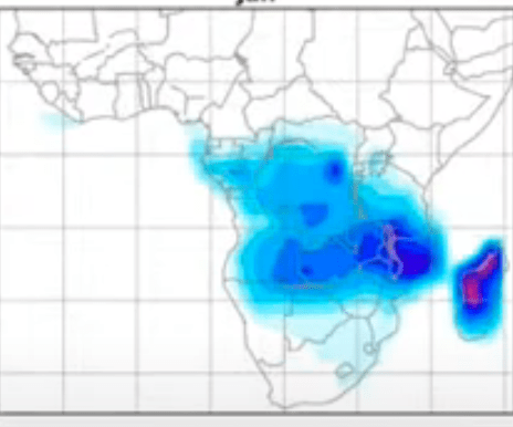 Above is the December thunderstorm activity – The sun is now over the tropic of Capricorn and it has dragged the trade winds south so that the moisture from the Indian ocean is blowing in over most of Central Africa.